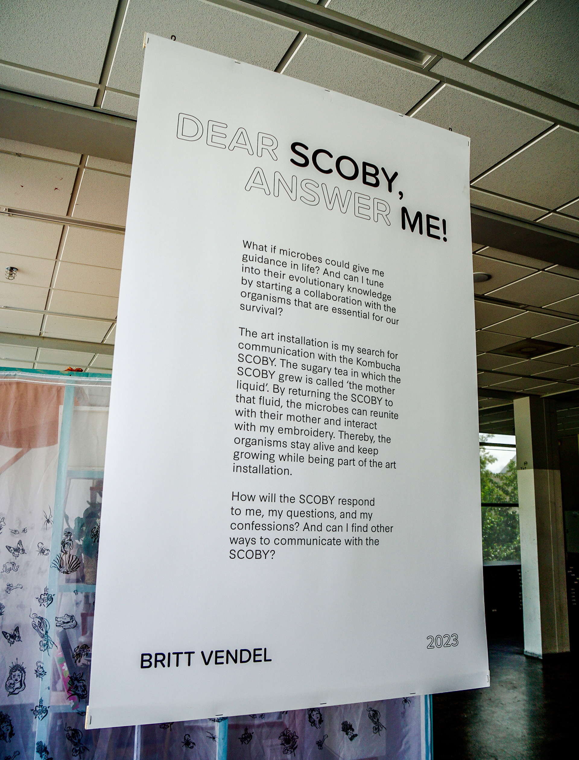 De gesuikerde thee waarin de SCOBY groeide wordt ‘de moeder vloeistof' genoemd. Door een werk te maken waarin ik de SCOBY steeds terugbreng naar die 'moeder vloeistof', kunnen de microben zich herenigen met hun moeder en interactie hebben met mijn borduurwerk. Daardoor blijven de micro-organismen in leven en blijven ze groeien terwijl ze deel uitmaken van de kunstinstallatie.